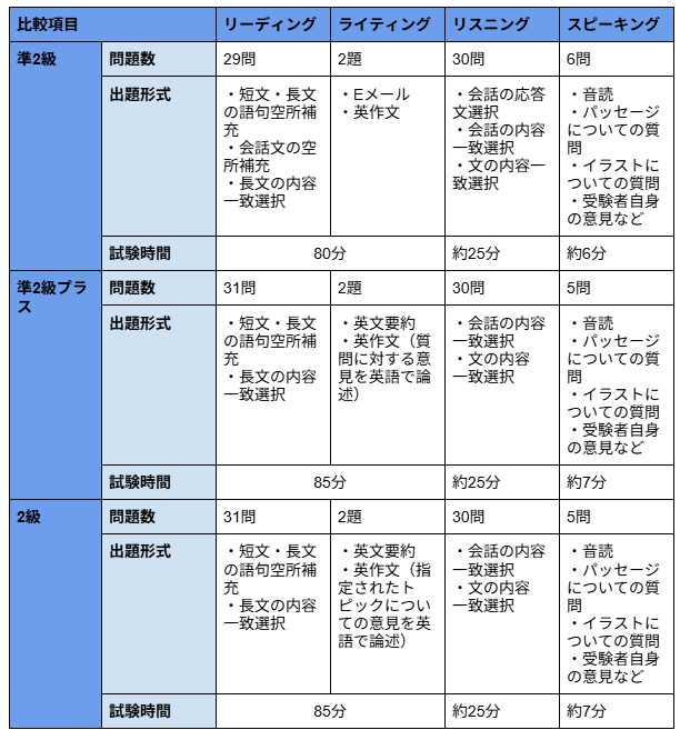 英検準2級プラスと準2級・2級における試験構成の違いは、以下のとおりです。