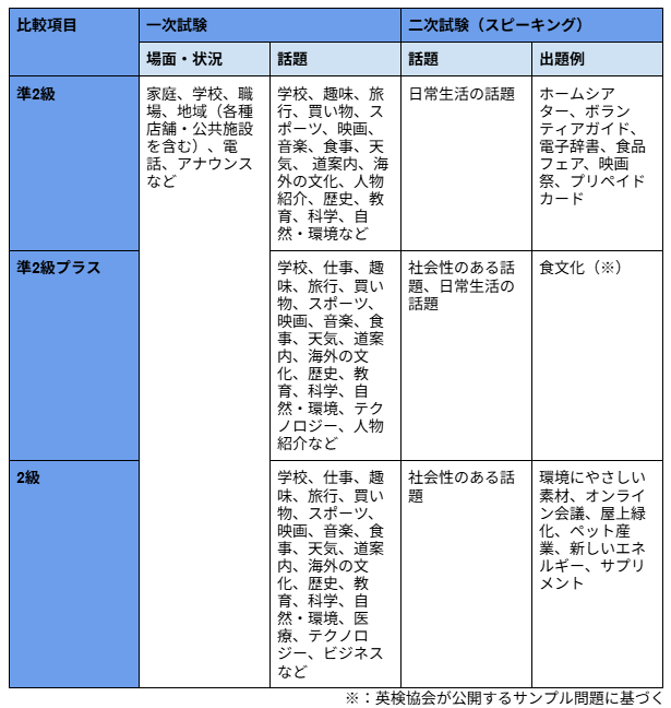 英検準2級プラスと準2級・2級の試験問題に用いられる出題テーマの違いは、以下のとおりです。