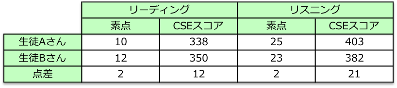しかし、リーディングのCSEスコア差は12点。一方、リスニングのCSEスコア差は21点。