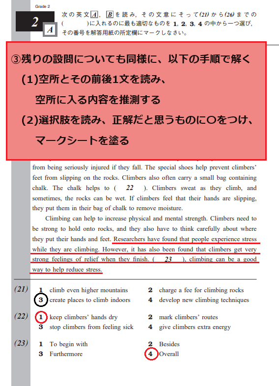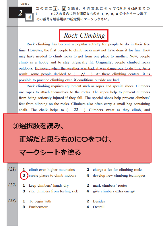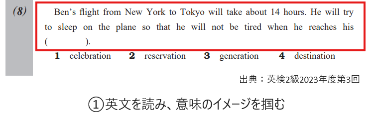 英検2級リーディングの大問1は、次の3つのステップで解いていきます。