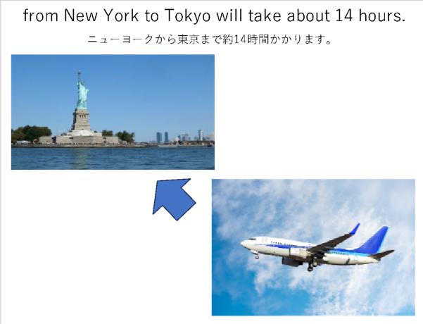 Ben’s flight from New York to Tokyo will take about 14 hours.(ベンが搭乗する飛行機は、ニューヨークから東京まで約14時間かかります)He will try to sleep on the plane so that he will not be tired when he reaches his ( ).(( )に到着したときに疲れていないように、彼は飛行機で眠るつもりです)