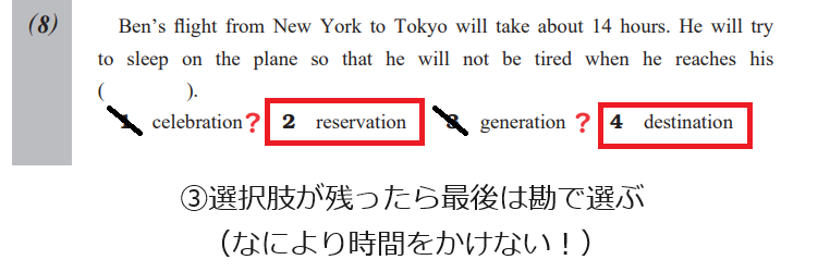 ですので、もし”reservation”と”destination”という2つの選択肢が残ったとしても「なんとなく” reservation””だな!」「なんとなく” destination”な気がする!」と、勘でさっさと選択肢を選んでしまいましょう。