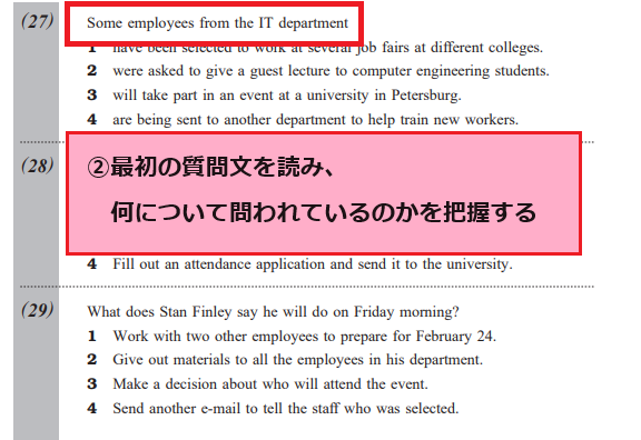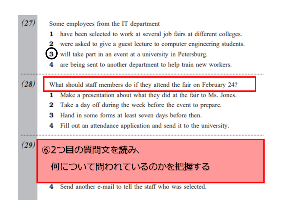 ⑥ 2つ目の質問文を読み、何について問われているのかを把握する