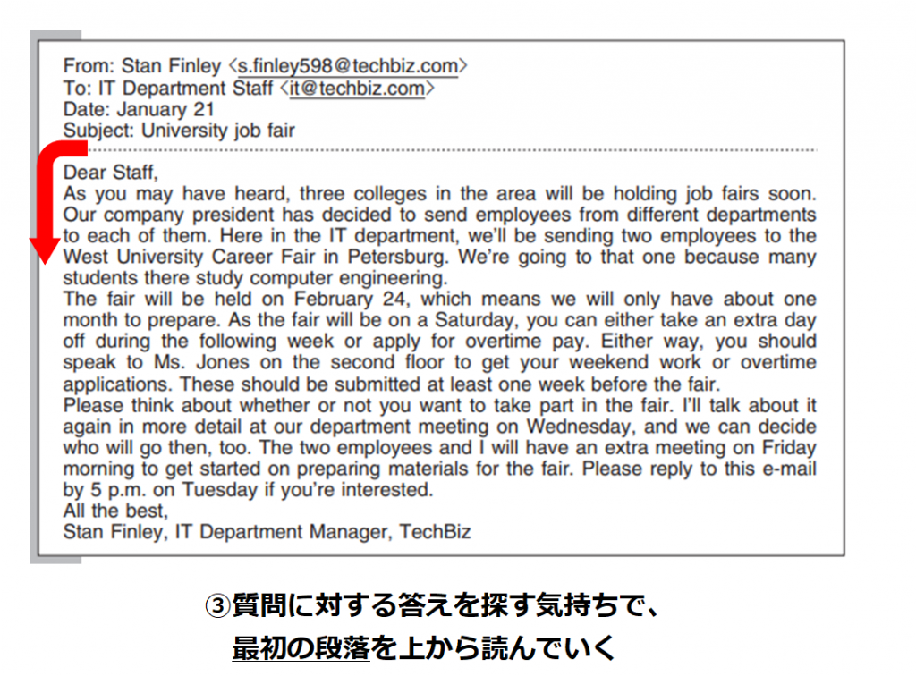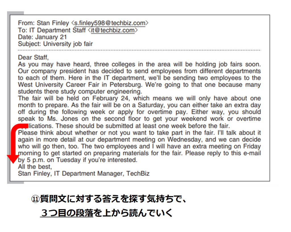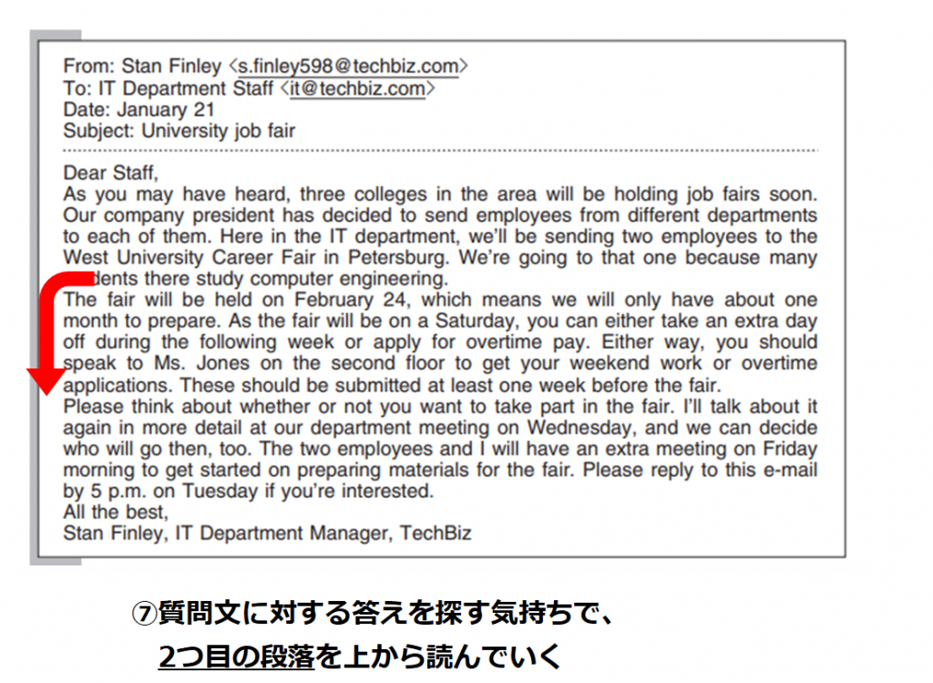 最後の設問の答えは、本文中の何段落目に書かれているかはわかりません。ですので、本文全体から見つける必要があります。