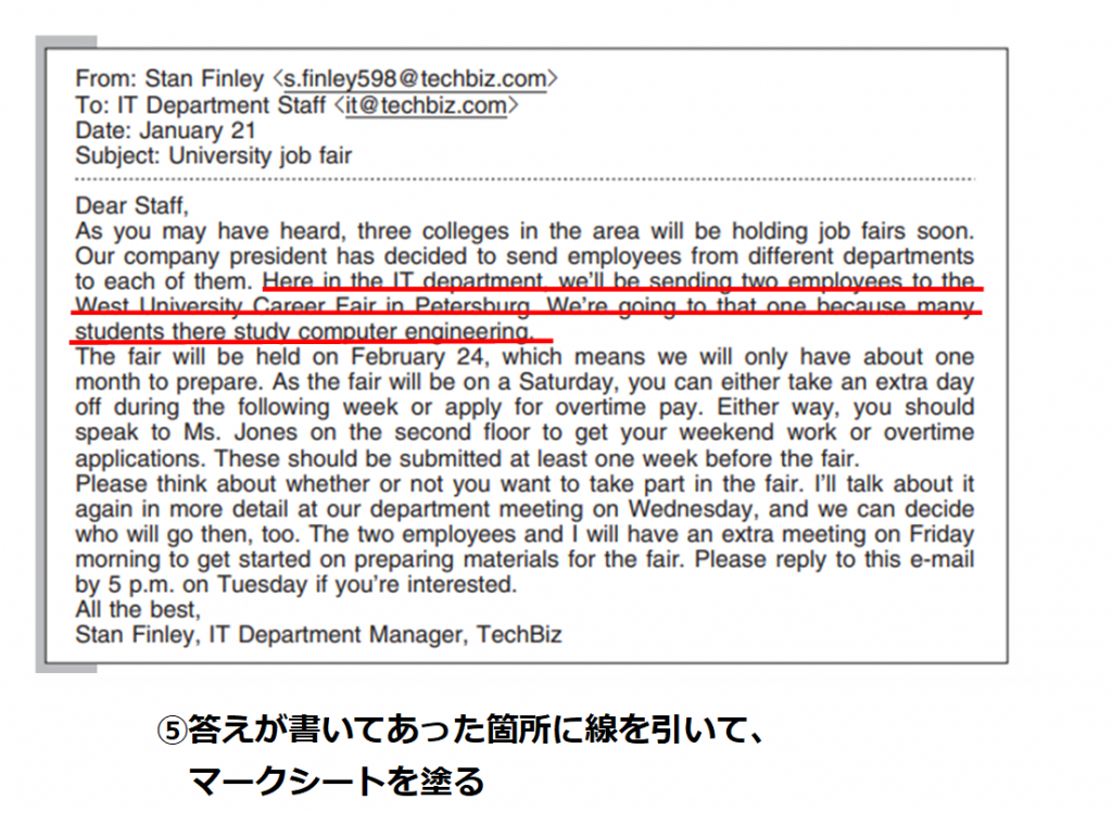 ⑷ 答えが書いてあった箇所に線を引いて、マークシートを塗る