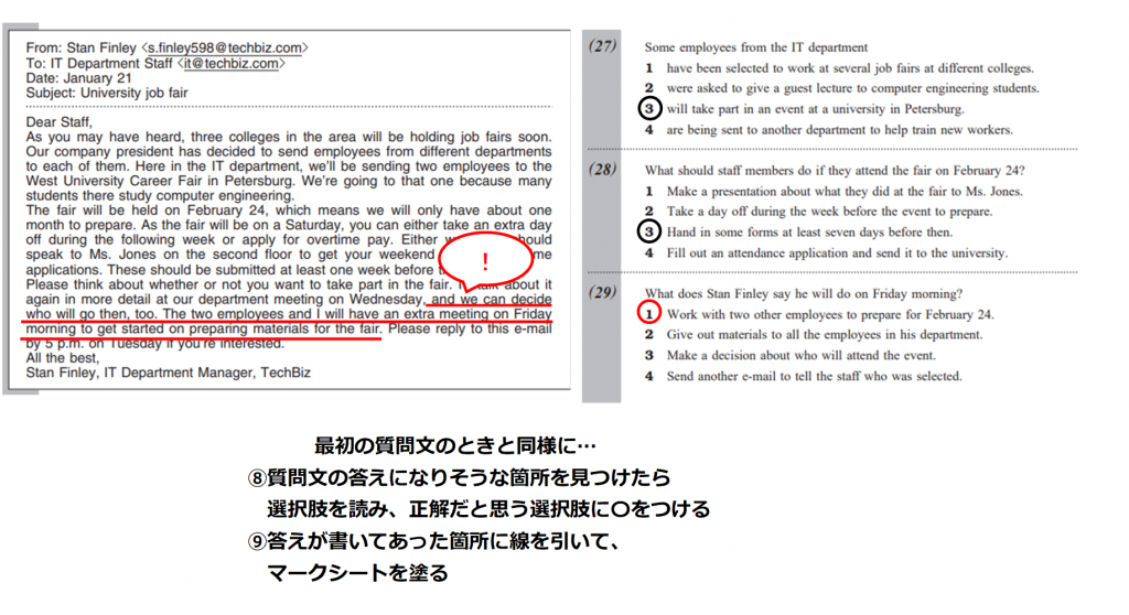 ⑶ 質問文の答えになりそうな箇所を見つけたら、選択肢を読み、正解だと思う選択肢に○をつける(選択肢の言い換えに注意)
