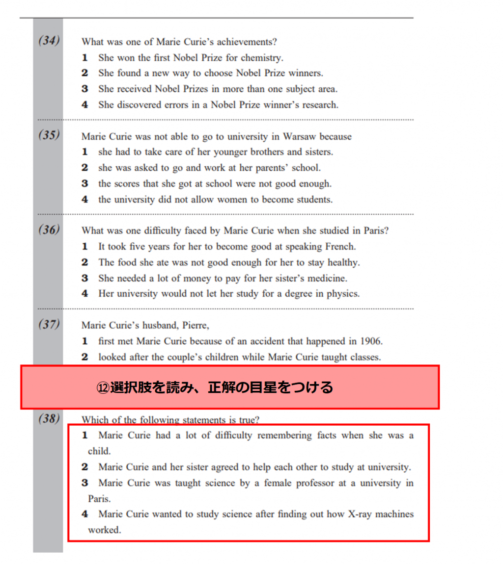 例えば、「選択肢の『2』のような内容が本文内に書いてあった気がする…」と一旦、正解の目星をつけるわけです。