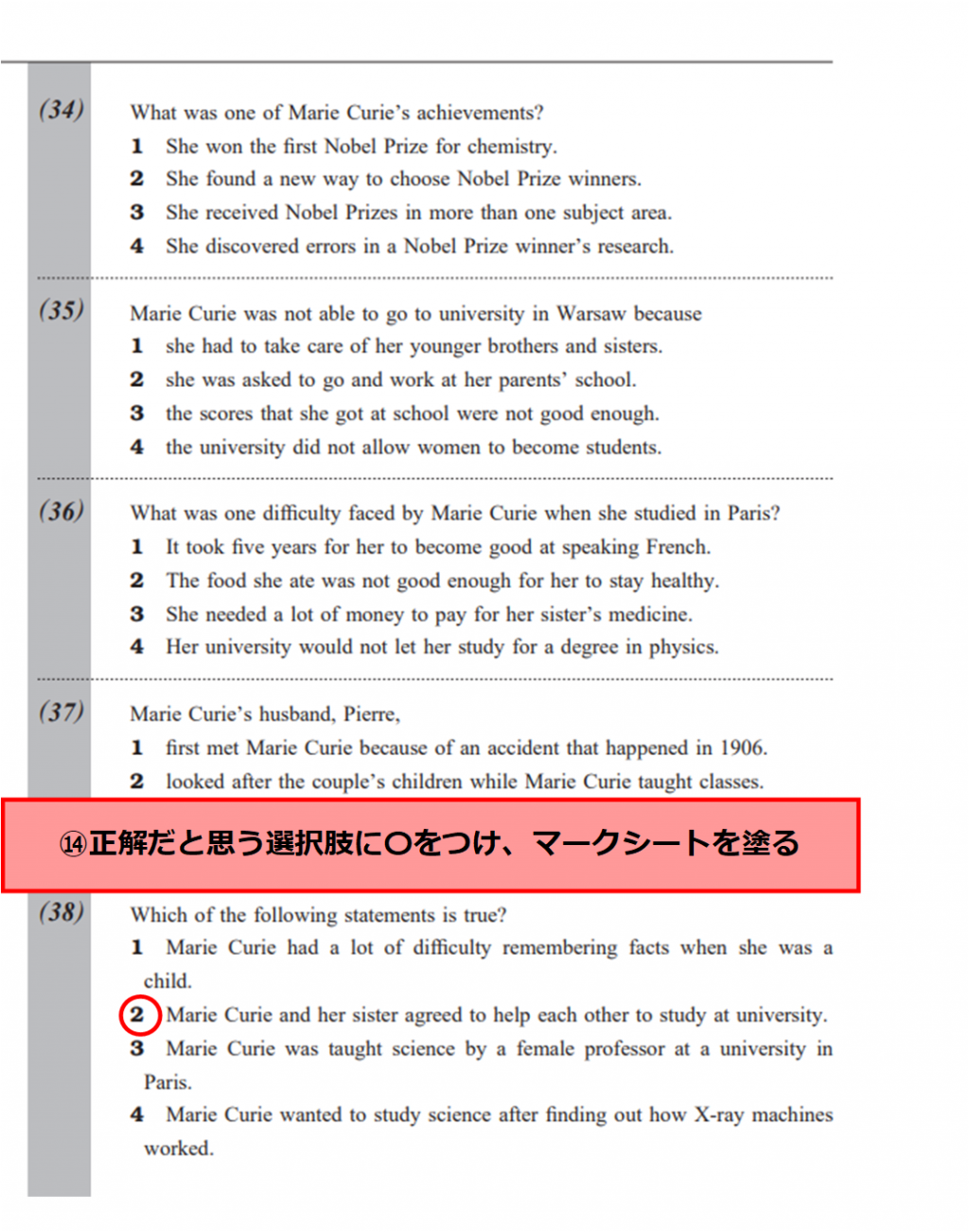 ⑭ 正解だと思う選択肢に○をつけ、マークシートを塗る