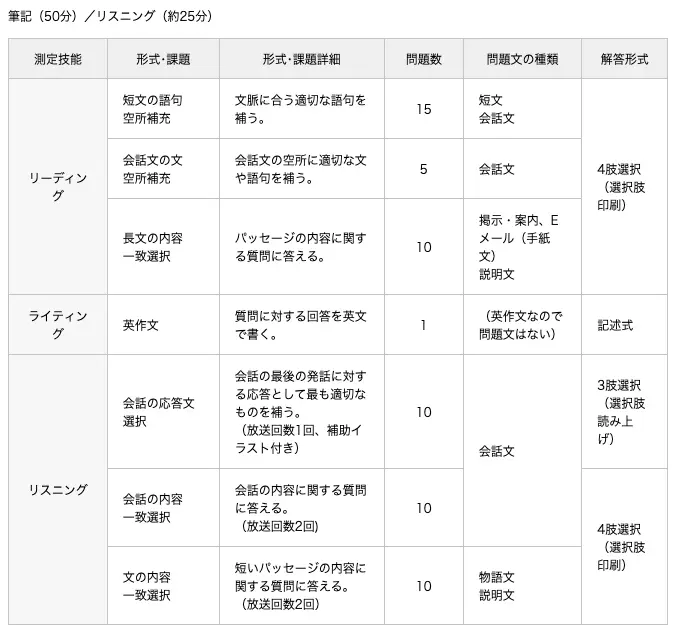 英検3級とは異なり、英検4級は一次試験のライティングや二次試験のスピーキング(面接試験)がありません(任意でスピーキングテストを受験できます)。