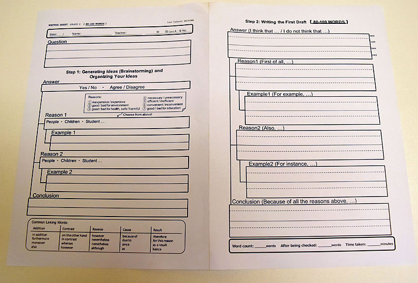 という手順でESL clubでは取り組みました。私は自分の意見をまとめるのが難しかったので、このライティングシートがあるとすごくやりやすかったです。今まで苦手だった英作文が好きになりました! 英検のテストでは使えないんですけど、英作文を速く書くために、冬休みに筆記体も覚えました。