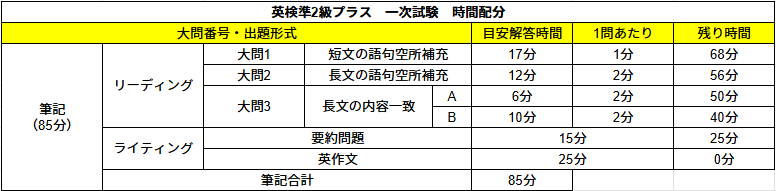 英検準2級プラス一次試験合格のための時間配分は、筆記全体が85分(試験時間は約110分)で終わる時間配分です。リーディング全体に45分、ライティングに40分かけます。