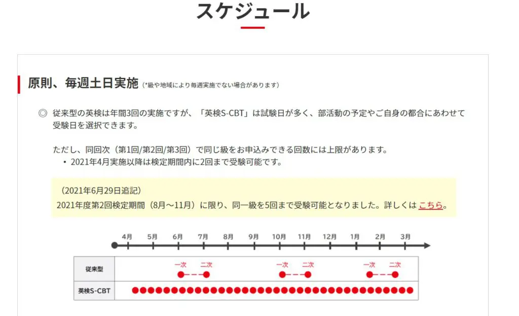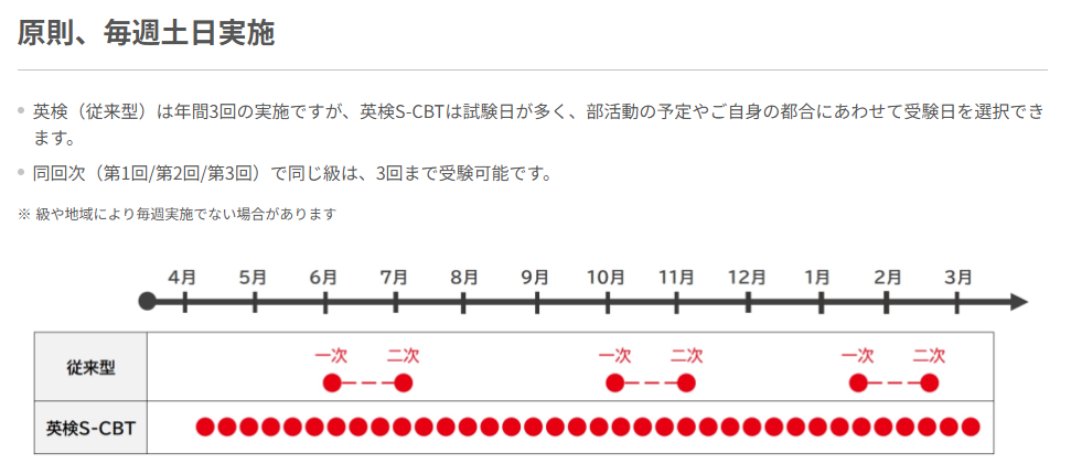 「S-CBT型」の英検は原則として毎週土日に実施されており、受験日の調整がしやすいでしょう。