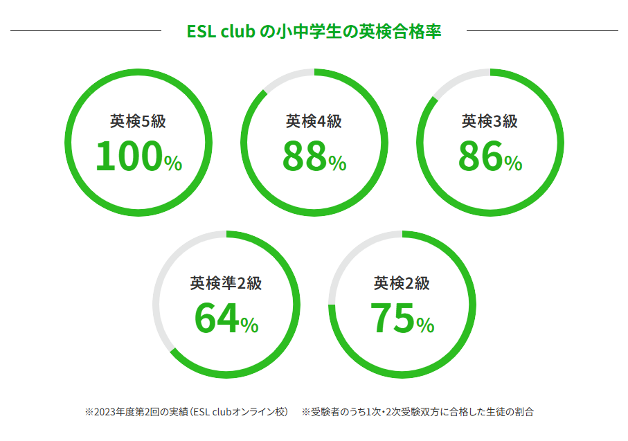 一般的に、英検®2級取得が高校卒業時の到達目標とされている中、ESL clubでは小学生、中学生時点での高い合格率を誇っています。