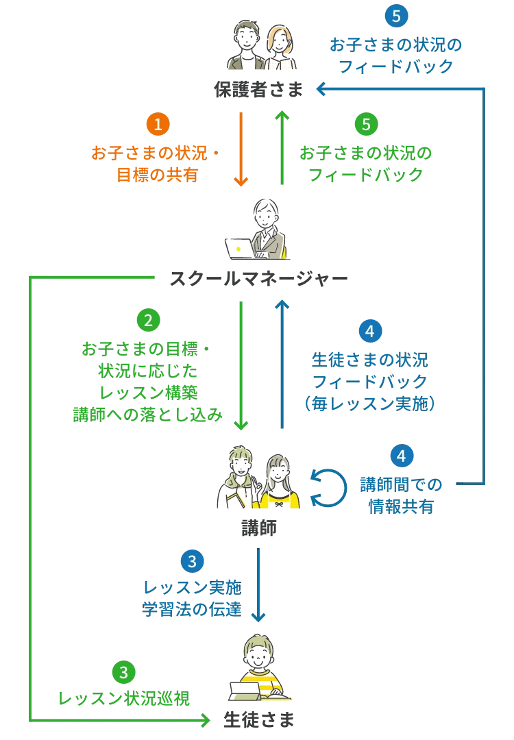 シャドーイングやエッセイライティングの指導といったバイリンガルによる個別指導だからこそのレッスンはもちろん、生徒一人ひとりに合わせた学習プランのご提案まで、教室と全く同じサービスをご提供いたします。